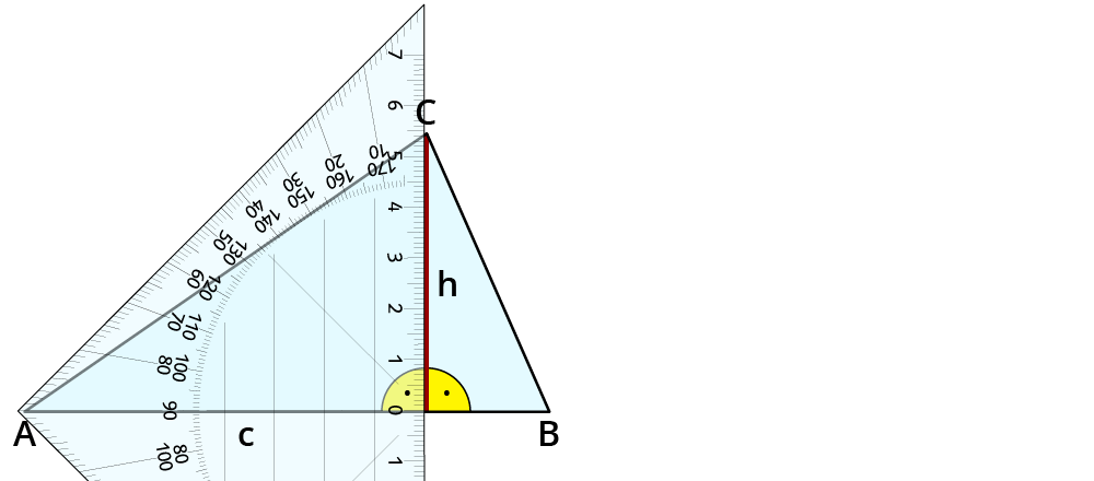 Die Höhe des Dreiecks auf Seite c bestimmst du, indem du das Geodreieck mit der Mittellinie auf Seite c anlegst. Jetzt schiebst du das Geodreieck so lange, bis du Punkt C erreichst. Dann kannst du den Abstand messen.