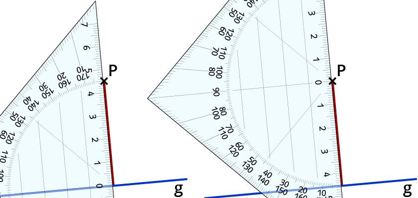 Wenn du prüfen willst, ob du wirklich eine Senkrechte gezeichnet hast, kannst die Spitze des Geodreiecks in den rechten Winkel legen. Passt die Spitze genau, ist auch ein 90°-Winkel vorhanden. Zur Not kannst du das auch mit einem Blatt Papier machen.