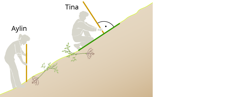 Mathematisch gesehen ist Tinas Stab senkrecht zum Berg. Mathematisch heißt „senkrecht zu etwas“, dass der Winkel zwischen den beiden gedachten Linien (hier Stab und Berg) 90° groß ist.