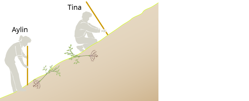 An einem Berg wollen Aylin und Tina einen senkrechten Stock einschlagen. Junge Bäume können an so einem Stock einfacher gerade hochwachsen.