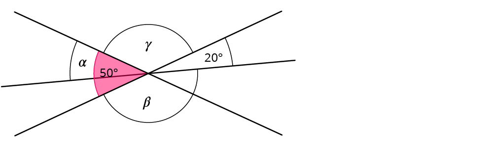 Der 20° große Winkel hat einen Scheitelwinkel, der „unterhalb“ von $$alpha$$ liegt und auch 20° groß ist. Laut Zeichnung sind $$alpha$$ + 20° = 50° $$rarr$$ $$alpha$$ = 30°