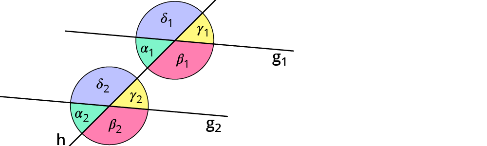 Damit der Überblick nicht verloren geht, sind die Winkel mit $$alpha_1$$…bis $$delta_1$$ an der ersten Parallele g1 und $$alpha_2$$…bis $$delta_2$$ an der zweiten Parallele benannt.