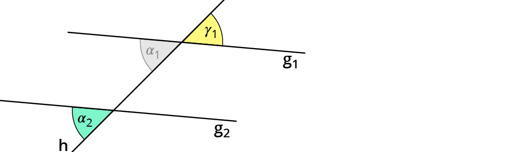 Wenn zwei parallele Geraden ($$g_1$$ und $$g_2$$) von einer dritten Geraden ($$h$$) geschnitten werden, dann entstehen 8 Winkel.
