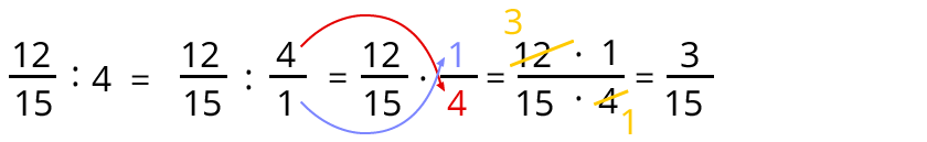 Deswegen gilt auch, dass $$12/15 : 4 = 3/15$$ ist. Hier kommt die ausführliche Rechnung: