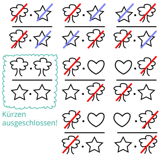 Hier ist aufgezeichnet, wie Kürzen erlaubt ist. Die gleiche Farbe steht dafür, dass diese beiden Symbole gekürzt wurden.