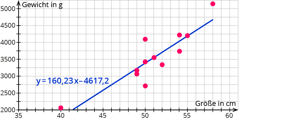 Die Gleichung des Graphen hat die Form $$y=mx+b$$, wie du sie von linearen Funktionen vielleicht schon kennst. Die Funktionsgleichung der Ausgleichsgeraden lautet: $$y = 160,23x - 4617,2$$