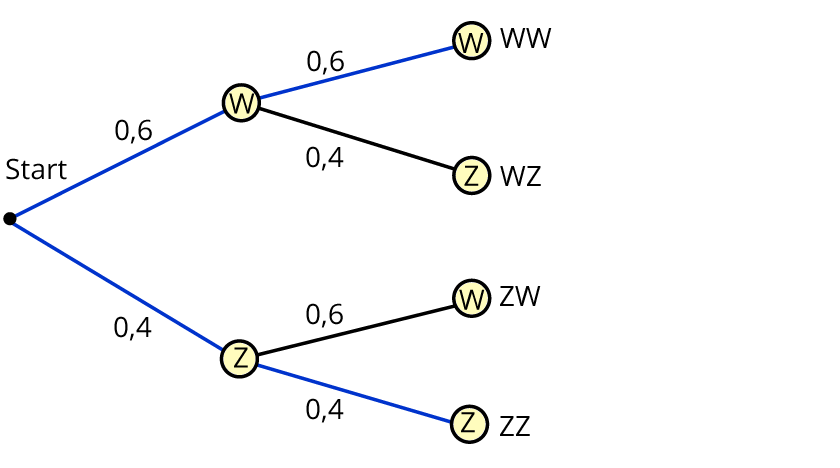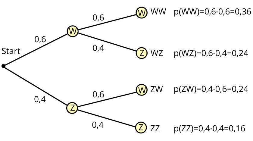 Beispiel: p(WW) = 0,6 $$*$$ 0,6 = 0,36