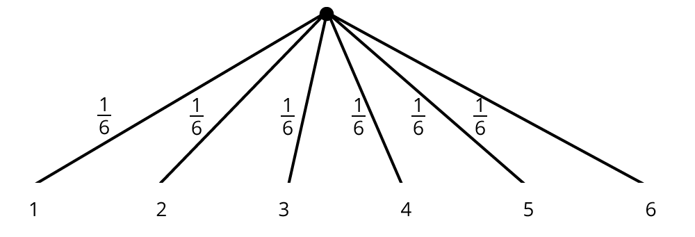 Du siehst hier ein Baumdiagramm für einen Würfelwurf. Es gibt 6 mögliche Ergebnisse: Die Augenzahlen 1 bis 6. Damit liegt die Ergebnismenge $$Omega$$ fest: $$Omega = {1, 2, 3, 4, 5, 6}$$.