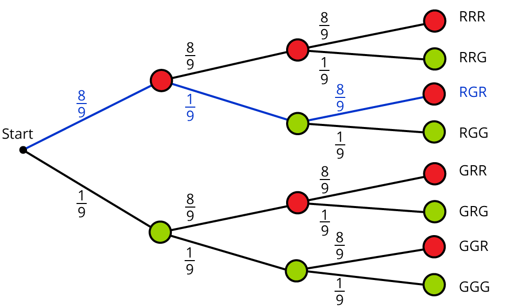 Das ErgebnisRGR wird, wie beim zweistufigen Zufallsexperiment der letzten Seite, aus dem Produkt der Wahrscheinlichkeiten längs des blauen Pfades berechnet: p(RGR) $$= \frac{8}{9} * \frac{1}{9} * \frac{8}{9} = \frac{64}{729}$$.