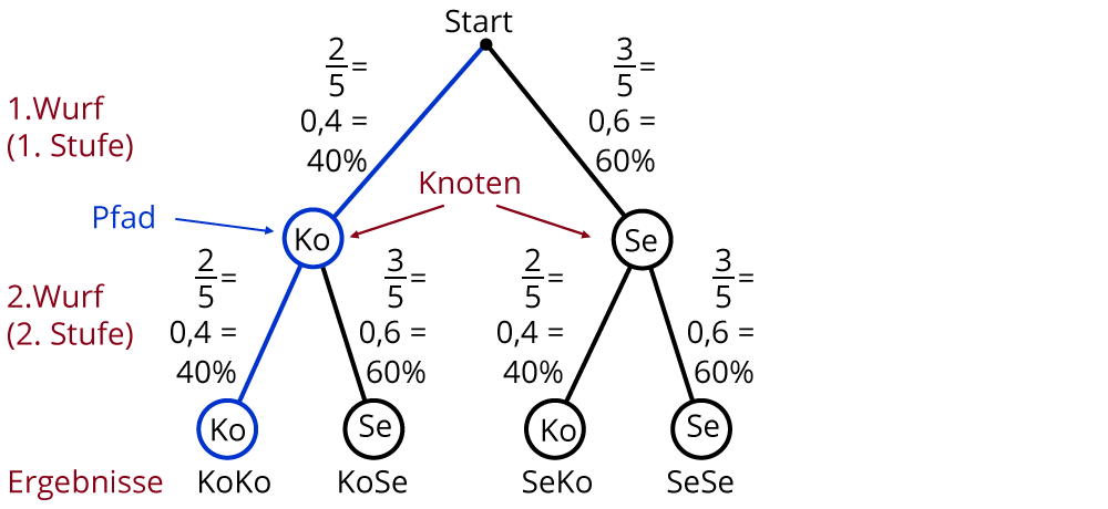 Es ist ein zweistufiges Experiment. Der Baum besteht aus zwei Stufen. Die Zweige sind Pfade der Länge 2. An den Pfaden stehen die Wahrscheinlichkeiten als Brüche, Dezimalzahlen oder Prozentzahlen.