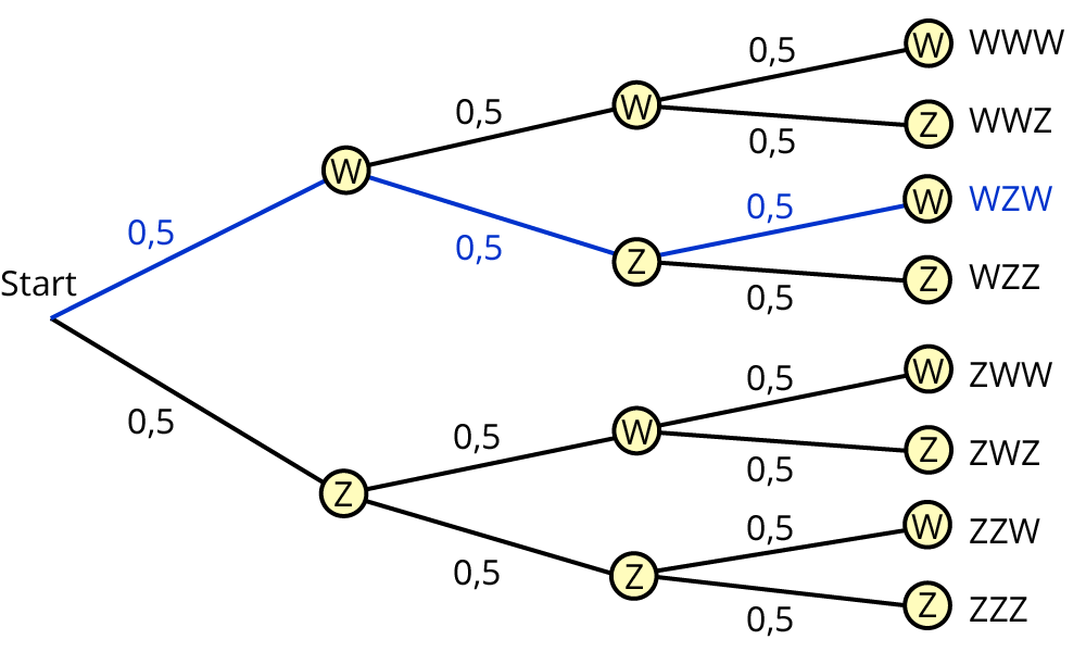 Du siehst hier ein Baudiagramm für einen dreifachen Münzwurf. Der Baum besteht aus drei Stufen. Zu jedem möglichen Ergebnis gehört ein Pfad, der am Start beginnt und über die zugehörigen Knoten bis zur letzten Stufe verläuft. Der blaue Pfad ist das Ergebnis WZW.