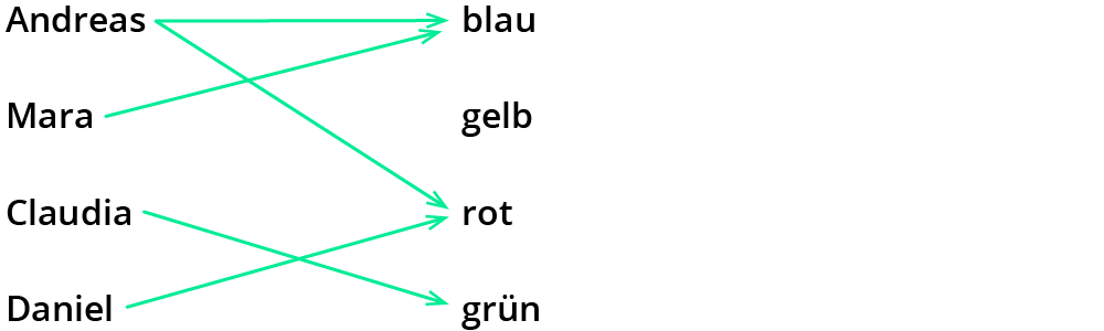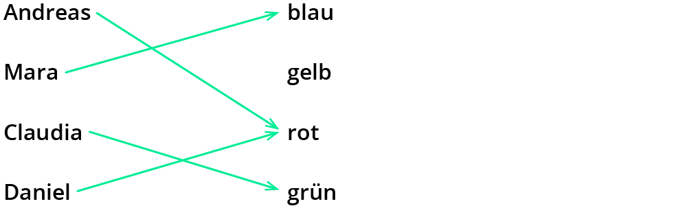 Hinweis: Verschiedenen Namen kann dieselbe Lieblingsfarbe zugeordnet werden. Andreas und Daniel haben die Lieblingsfarbe rot. Entscheidend ist, dass einem Namen nicht mehr als eine Lieblingsfarbe zugeordnet wird.