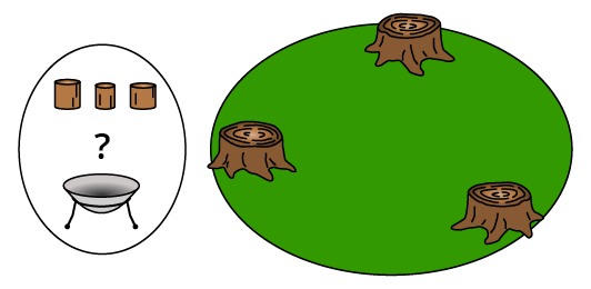 Im Garten von Tante Waldtraud stehen 3 Baumstümpfe um eine Feuerschale. David, Ömer und Pablo wollen Samstagabend am Feuer sitzen. Sie wollen die Feuerschale so hinstellen, dass sie von den 3 Baumstümpfen genau gleich weit entfernt ist.