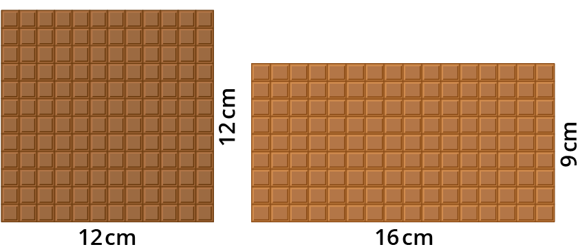 Jana und Tarek essen gern Schokolade. Jana bevorzugt eine Sorte, die von oben wie ein Quadrat aussieht. Die Seiten sind alle jeweils 12 cm lang. Die Sorte von Tarek ist von oben betrachtet ein 16 cm langes und 9 cm breites Rechteck.