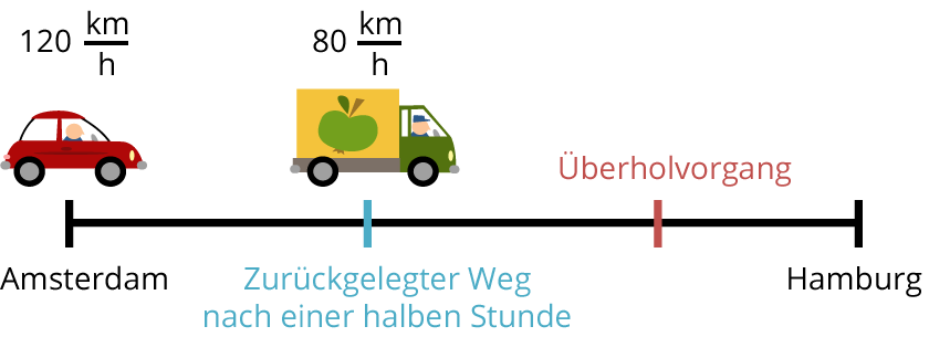 Ein LKW soll eine Ladung Obst von Amsterdam nach Hamburg bringen. Der Weg von Amsterdam nach Hamburg beträgt $$465$$ km. Der LKW fährt mit einer Geschwindigkeit von $$80$$ km/h. Familie Thiele kommt aus Hamburg und hat Urlaub in Amsterdam gemacht. Die Thieles fahren eine halbe Stunde später los als der LKW. Die Familie ist mit einer Geschwindigkeit von $$120$$ km/h unterwegs.