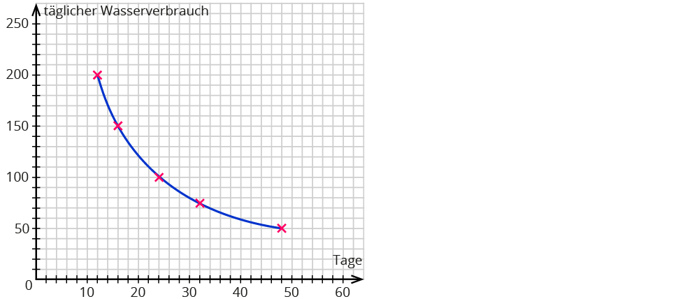 Zeichne die $$x$$-Achse etwas länger als 50 Tage (1 Kästchen = 2 Tage) und die $$y$$-Achse etwas länger als 200 Liter (1 Kästchen = 10 Liter).
