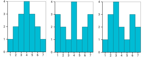 Alle drei Verteilungen haben den Erwartungswert $$4$$. Die Streuung der Wahrscheinlichkeitsverteilung ist recht unterschiedlich und zeigt nicht, wie sich die einzelnen $$P(X)$$-Werte zum Erwartungswert gruppieren - ob sie sich z.B. um den Erwartungswert symmetrisch gruppieren oder wie im letzten Bild unsymmetrisch angeordnet sind.