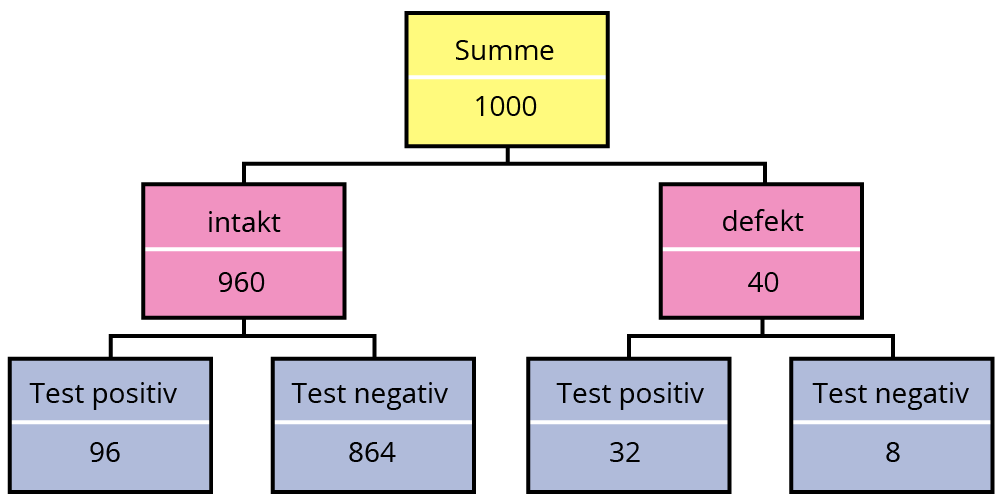 Eine Elektronik-Firma stellt immer Serien von 1.000 Bauteilen einer Sorte her. Aus Erfahrung ist bekannt, dass von einer Serie 40 Teile defekt sind. Bei der Endkontrolle werden mit einem Testverfahren 32 davon auch erkannt (Test positiv). Die Firma geht mit dem Test das Risiko ein, dass von den intakten Bauteilen 96 fälschlicherweise als defekt (Test positiv) eingestuft werden.
