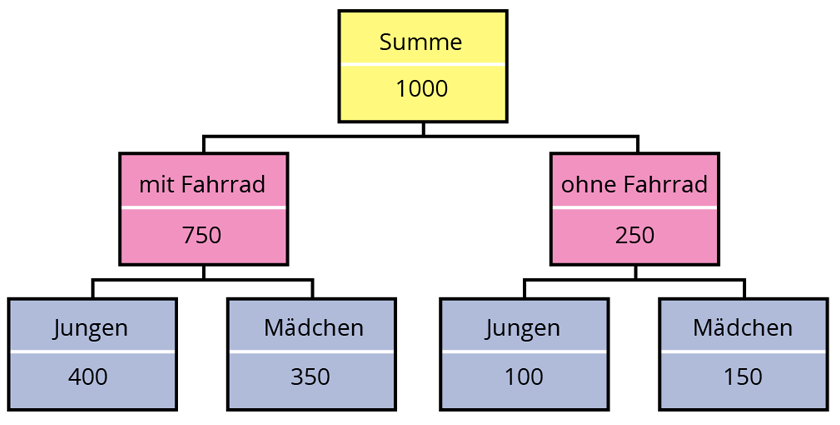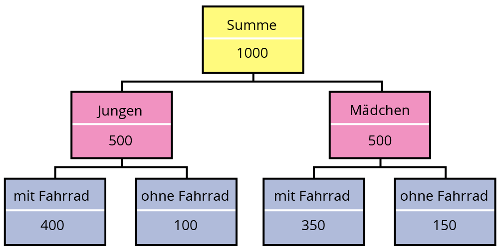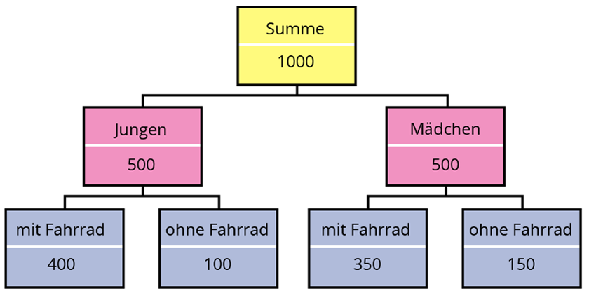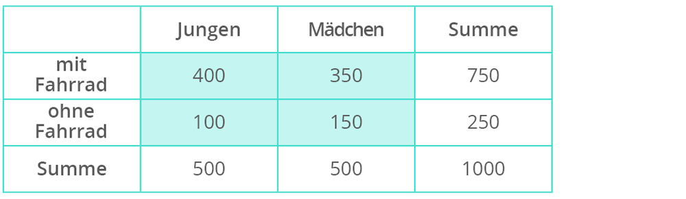 In einer Umfrage wurden 1000 Schüler danach befragt, ob sie regelmäßig mit dem Fahrrad zur Schule fahren. Von den 500 befragten Jungen kommen 400 regelmäßig mit dem Fahrrad zur Schule, von den 500 befragten Mädchen waren es 350.