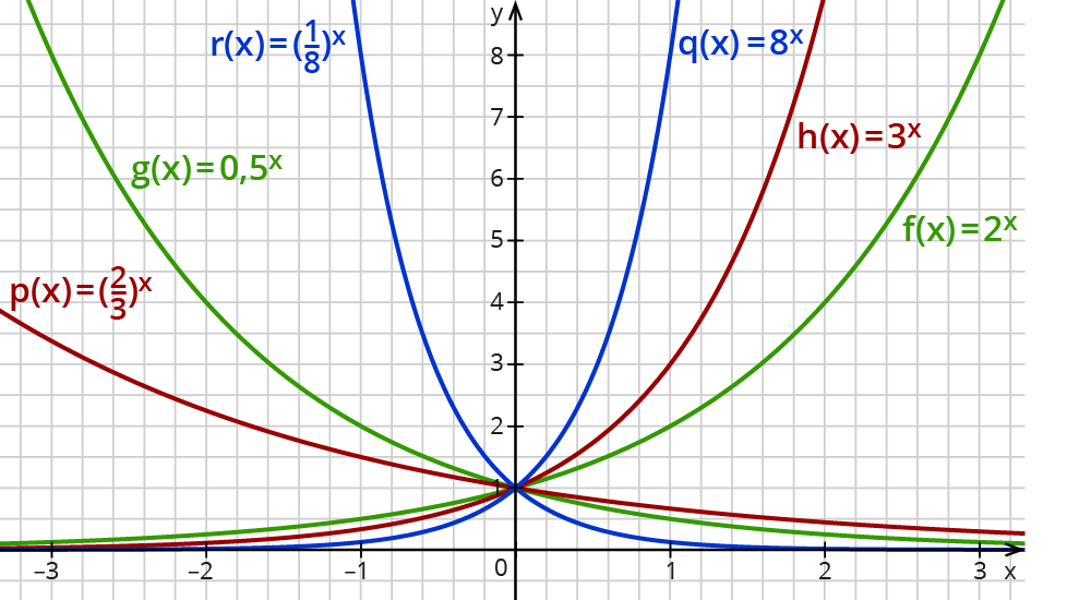 Eine Funktion mit der Gleichung $$y=b^x$$ mit $$b>0$$ und $$b\ne1$$ heißt Exponentialfunktion zur Basis $$b$$.