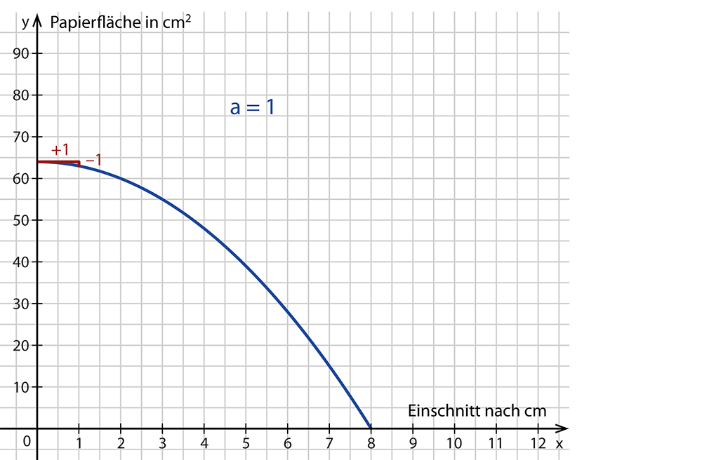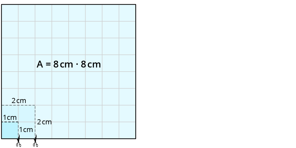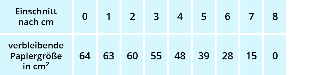 Es regnet nun schon den ganzen Tag. Paul ist schlecht gelaunt. Er schnappt sich ein quadratisches Blatt 8 cm x 8 cm Papier und beginnt in der Ecke einen Streifen abzuschneiden. Er schneidet jeweils nach 1 cm ein. Anschließend schneidet er im Abstand von 2 cm wieder ein. Dies wiederholt er fortlaufend. Das Blatt verkleinert sich vom Flächeninhalt so jeweils immer. Beim ersten Streifen verkleinert sich der Flächeninhalt des Blattes um 1 cm².