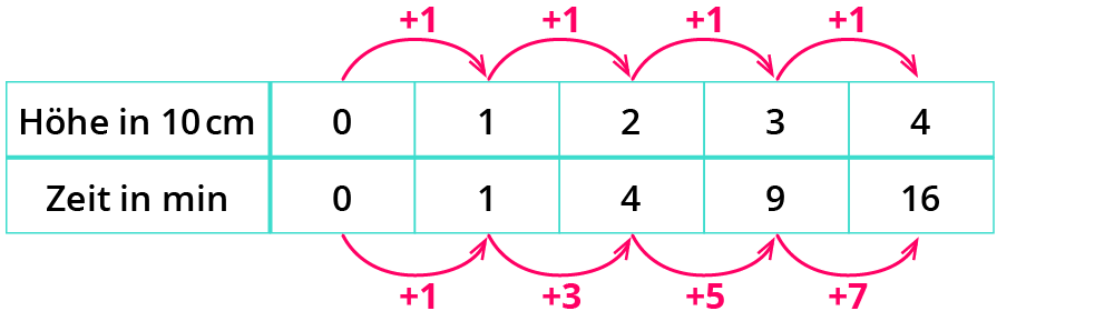 Eine Tabelle zeigt den Zusammenhang zwischen Höhe und Zeit: