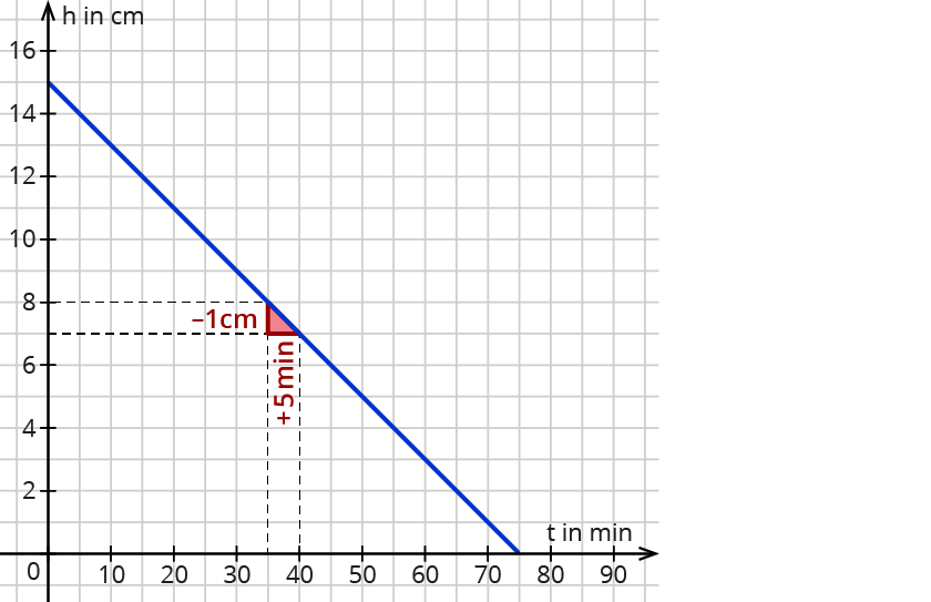Sie erkennt folgende Funktionsgleichung: $$h(t)=15 cm - {1cm}/{5 min} *t$$ oder $$h(t)= - {1cm}/{5 min} *t+15 cm$$