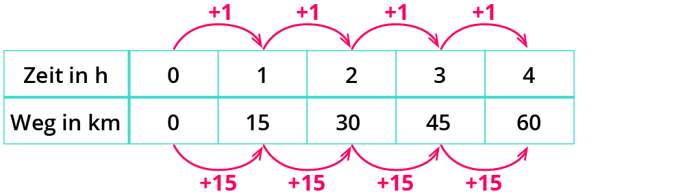 Pro Zeiteinheit einer Stunde nimmt die Strecke um 15 km zu. Damit wissen wir $$m=15 {km}/h$$.