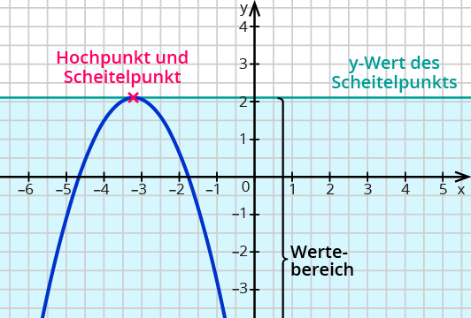 Den Wertebereich der Funktion kannst du sofort angeben, wenn du den Scheitelpunkt der Parabel kennst und weißt, ob es Tiefpunkt oder Hochpunkt ist.