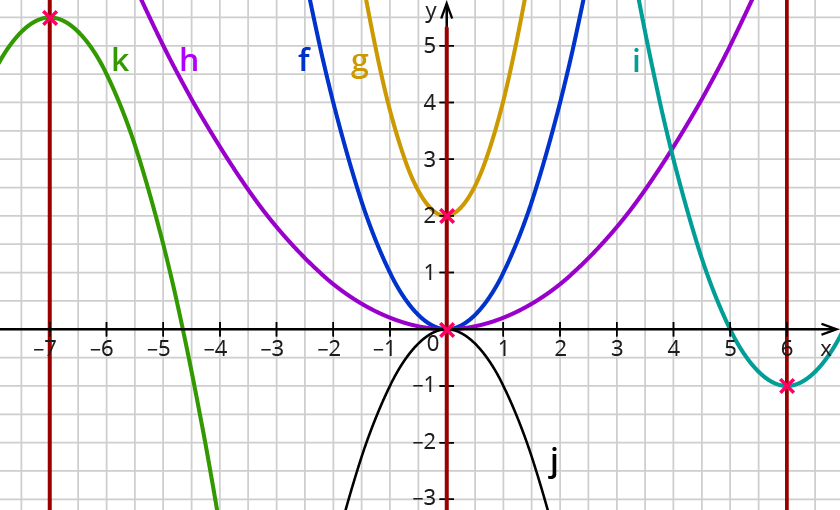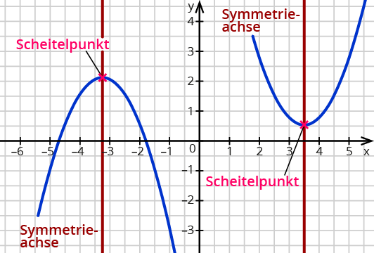 – allen Werten unterhalb des Scheitelpunktes, wenn es ein Hochpunkt ist.Quadratische Funktionen besitzen eine Spiegelachse. Sie verläuft parallel zur $$y$$-Achse durch den Scheitelpunkt.