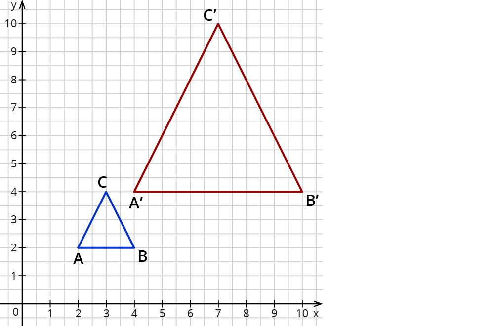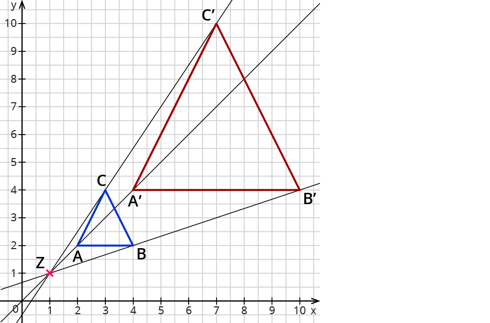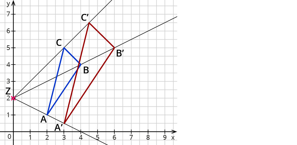 Konstruiere in einem Koordinatensystem das Dreieck $$ABC$$ und zeichne das Streckzentrum $$Z$$ ein. Führe dann eine zentrische Streckung mit dem Streckfaktor k durch.