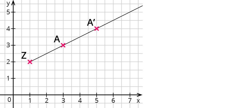 Trage die Strecke $$bar(ZA)$$ von $$Z$$ aus zweimal auf dem Strahl ab. Du erhältst den Punkt $$A’$$.