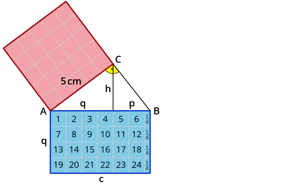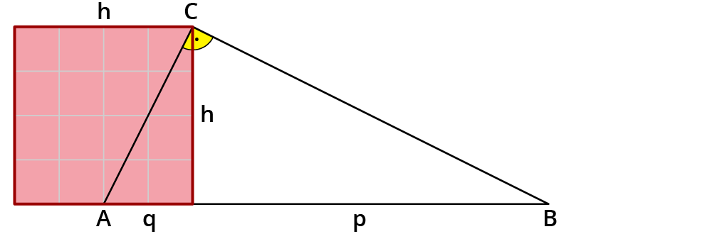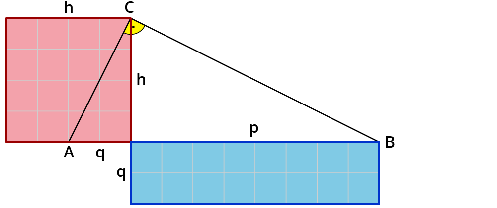 In Worten gesprochen bedeutet der Höhensatz: Zeichnest du ein Quadrat mit der Seitenlänge $$h$$, ist das genauso groß wie der Flächeninhalt des Rechtecks mit den Seiten $$p$$ und $$q$$.