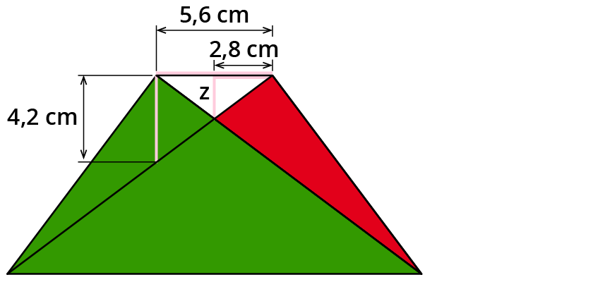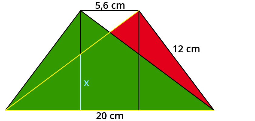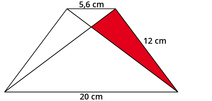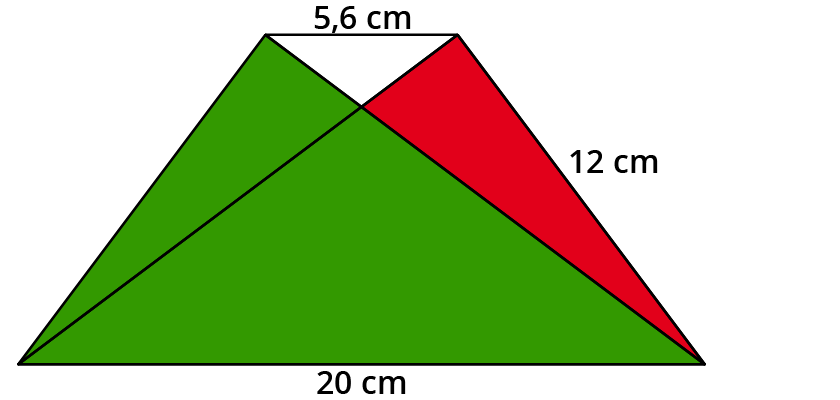 In einem gleichschenkligen Trapez mit $$a = 20$$ $$cm$$, $$b = 12$$ $$cm$$ und $$c = 5,6$$ $$cm$$ sollst du herausfinden, wie groß der gefärbte Anteil am gesamten Trapez ist.