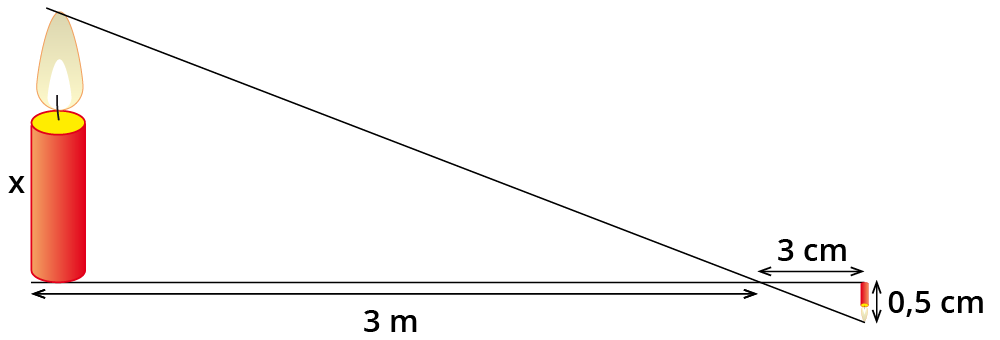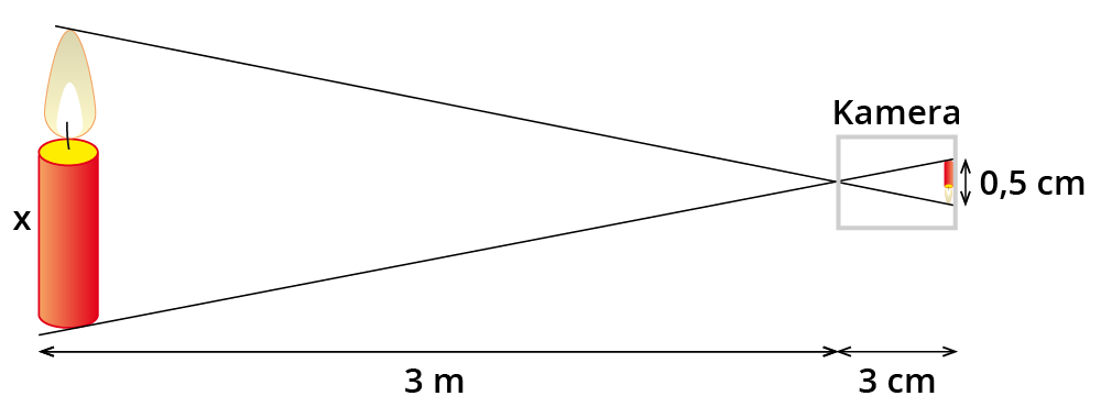 Du bist 3 m von einer Kerze entfernt. Du fotografierst die mit einer 3 cm breiten Kamera. Auf dem Bild ist die Kerze 0,5 cm hoch. Wie hoch war sie in echt?