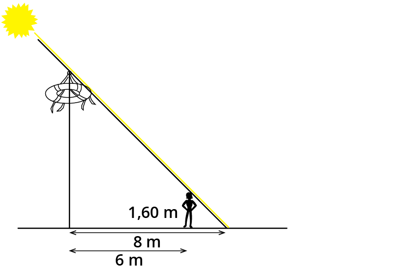 Jana will die Höhe des Maibaums bestimmen. Sie kann seinen Schatten messen. Er ist 8 m lang. Sie selbst ist 1,60 m groß und stellt sich so, dass ihr Schatten genau mit dem Schattenende zusammenfällt. Jana selbst steht 6 m vom Maibaum entfernt. Wie hoch ist der Maibaum?