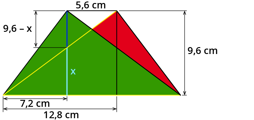 Wieder mit dem 1. Strahlensatz stellst du eine Verhältnisgleichung auf, um die Höhe des weißen Dreiecks zu berechnen.