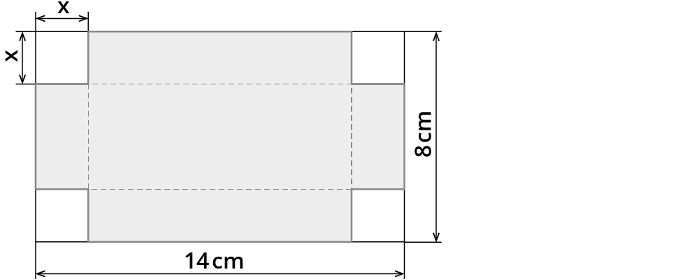 Mit $$x$$ als Seitenlänge der fehlenden Quadrate ergibt sich das Volumen zu: