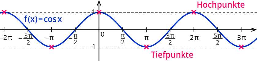 Die Hochpunkte haben die Koordinaten $$(2pi*k | 1)$$ für $$k in ZZ$$.